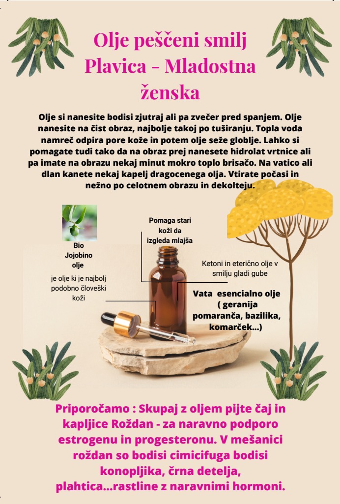 Zvečer si privoščim nekaj kapljic Olja Mladostna ženska – pravega smilja z Visa, ki sem ga pripravila sama. Pomladi, gladi in nahrani kožo.